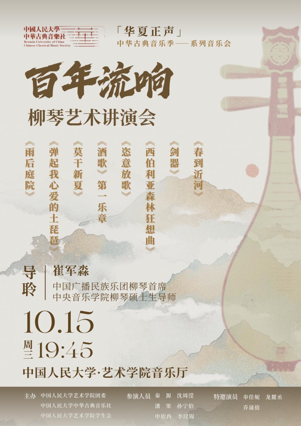 2025年10月15日,中国人民大学艺术学院音乐厅内,一场以“百年流响”为主题的艺术讲演会圆满落幕。本次讲演会由中国人民大学艺术学院团委与中华古典音乐社联合主办,作为“华夏正声”中华古典音乐季中极具代表性的一场演出,集中呈现了柳琴艺术的百年脉络与当代风貌。从传统经典到现代新创,多首柳琴作品在演奏者的指尖流转之间,勾勒出一幅跨越时空的国乐长卷,展现出柳琴艺术从民间雅韵到舞台新声的完整发展路径。