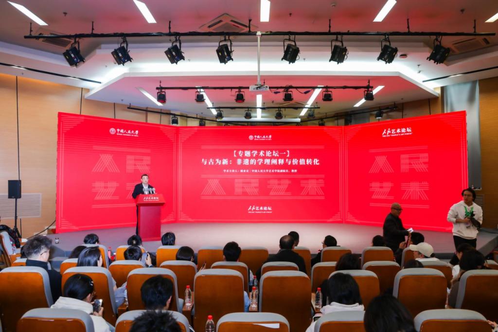 主旨演讲环节由中国人民大学艺术学院院长张淳主持。多位来自全国文艺与非遗领域的学者与嘉宾围绕“非遗融入现代生活”主题发表演讲,从不同学科视角阐释非遗保护与创新发展的多维路径。中国文联副主席潘鲁生作题为《中国非物质文化遗产保护的基本原则》的演讲,从四个方面系统梳理了非遗保护工作的理念框架与实践经验;北京印刷学院院长田忠利以《以出版与设计之力,构建“非遗活化”的创新生态》为题,从出版美学出发,探讨出版设计在推动非遗传播中的转化作用;北京舞蹈学院院长许锐以《中国传统民族民间舞蹈的当代转化》为题,分享了表演艺术类非遗的创新路径;清华大学人文讲席教授杭间以《“非遗”与当代创新》为题,从学术角度深入分析了非遗在保护传承中“守正”与“创新”的关系;依文集团董事长夏华以《释放民族文化原力,让世界看见中国文化之美》为题,展示了非遗在产业振兴与国际传播中的现实意义;中国工艺美术大师、国家级非物质文化遗产景泰蓝制作技艺代表性传承人钟连盛以《景泰蓝艺术的当代创新应用》为题,分享了景泰蓝的制作工序、发展历史以及传统技艺的转型实践成果。专家的演讲共同勾勒出非物质文化遗产在当代从“固本”到“求新”,再到“赋能”的清晰发展蓝图。