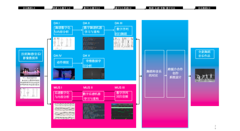 方法概述:基于DAMUS原型思想,将舞蹈动作与音乐材料建立可计算的映射:舞段以骨架关键点、节奏密度、能量包络等作为观测序列,采用隐马尔可夫模型(HMM)进行“身法—乐句”的序列对齐与段落切分,再由编舞/作曲等专家在排练中执行人工校准(含“呼吸点—收势”“错峰对齐”与空间化声像的舞台验证)。系统强调“舞—乐”双向生成与协作界面设计,以缩短沟通成本并提升迭代效率。有关系统构成与协作动机、算法与创作约束的整体思路,可参见DAMUS的系统性描述与案例实践提要。协作与路径:DAMUS将舞蹈模块(MoCap/Labanotation数字化)与音乐模块(节拍/速度/风格约束的素材生成)以可交互方式耦合,强调“创意碎片—快速变奏—再选择”的循环,以减少跨工种语言壁垒与时间消耗,形成可追溯的版本树与证据链。学术要点:HMM的可解释状态空间使“近读的专业经验”可嵌入“远读的统计表征”,人工校准则将模型输出拉回“可演与可达”的区间;二者共同确保“可言传”不失“可舞台执行”。