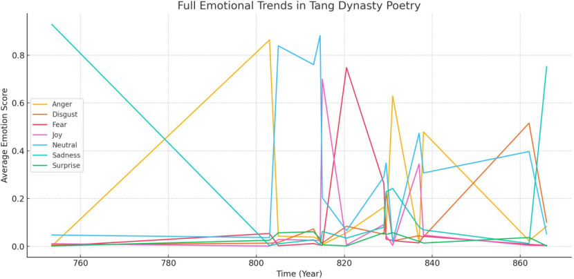 数据与方法:基于《全唐诗》《全宋词》抽样并清洗,建立意象词表与修辞标签;以中文BERT进行七类情绪(怒、厌、惧、乐、中性、哀、惊)分布估计,并据此与绘画/器物之风格分期进行跨媒介互证。方法、抽样与情感范畴设置参见论文的方法学节。主要发现(概括):唐代牡丹意象以“欢宴/喧腾”为主,并随中晚唐政局转折出现“愤怒”的增长,其中也伴有唐宪宗元和中兴时期短暂的欢愉气氛;宋代梅意象强化“清寒/坚贞/自守”,在两宋之际与家国叙事、亡国之痛密切勾连。文本端的情绪强度变化,与绘画之构图/色相与留白美学演进呈现可辨的同频,个体诗家(如李清照、王安石、陆游等)亦见差异化的政治与性别维度。相关统计与图像个案详见研究文本与图表。 学术意义:以BERT的上下文敏感向量承接“意象—修辞—情绪”之间的模糊边界,以“跨媒介互证”把远读统计与近读风格学闭合为可证链条**,并与数个既有研究脉络对话(如面向古典语料的领域化BERT与艺术史风格分期的量化尝试),此处,科技赋能的使人文研究增添了传统研究视角下未见的温度。
