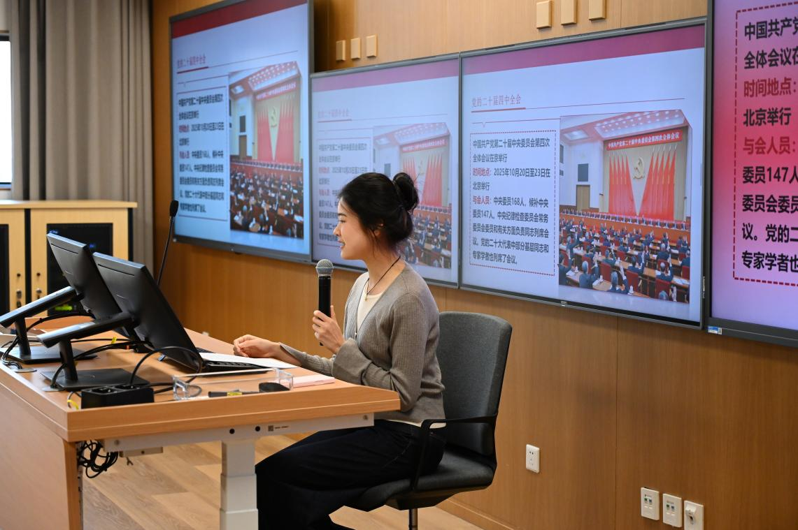 接下来中国人民大学学生党建促进会、马克思主义学院博士生宣讲团讲师郭芸菲同志围绕“扎实推进共同富裕:从党的二十届四中全会看中国未来五年的民生发展”这一主题,为在场党员带来一场内容丰富、观点鲜明的理论分享。郭芸菲同志指出,未来五年,推进共同富裕的关键在于抓住民生领域的重点任务,实现高质量发展与高品质生活的良性互动。