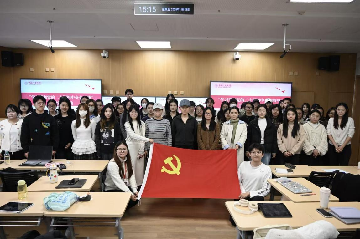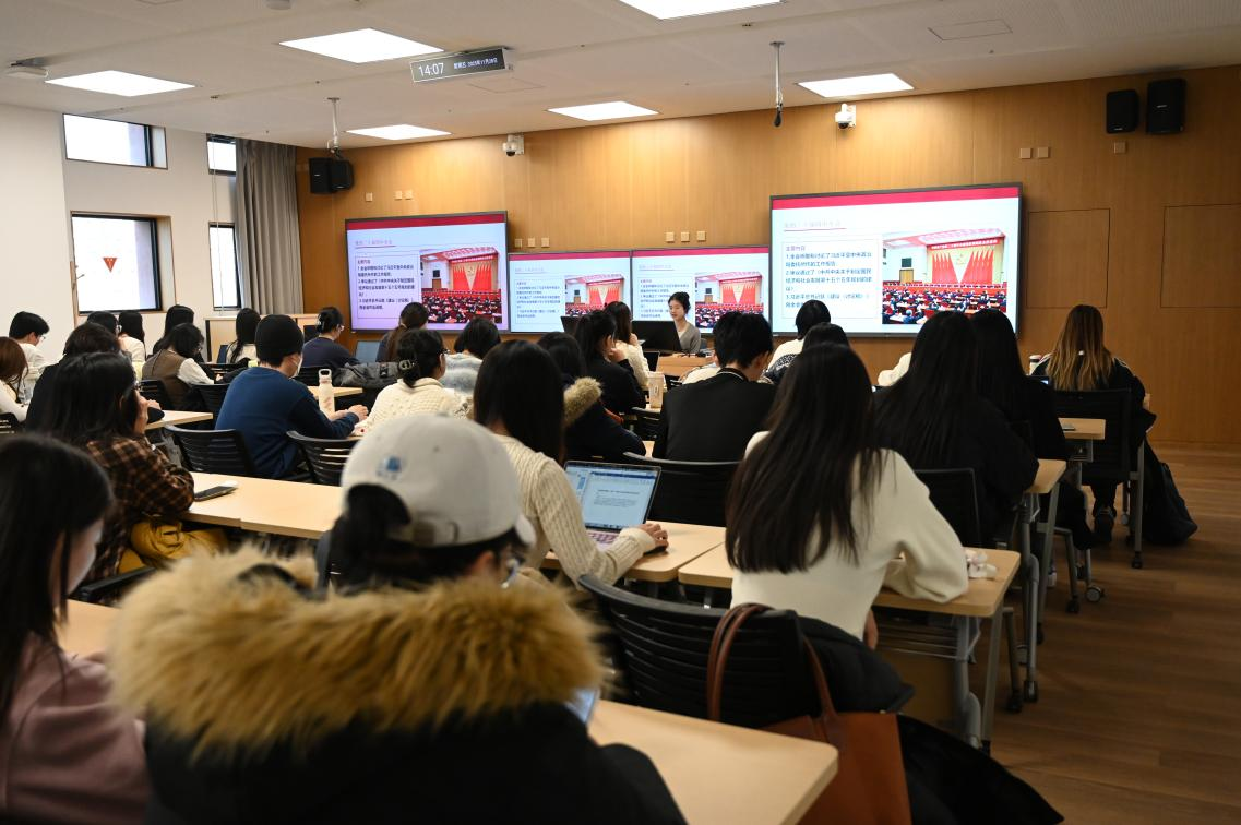 11月28日下午,艺术学院2025级硕士生党支部、外国语学院2025级硕士生第一党支部、劳动人事学院社会保障硕士党支部,在叶澄海楼241教室共同举办“学习贯彻党的二十届四中全会精神”主题党日活动。活动由艺术学院2025级硕士生党支部书记陈卓同志主持,邀请马克思主义学院博士生宣讲团成员郭芸菲,带领支部同志们学习党的二十届四中全会精神。