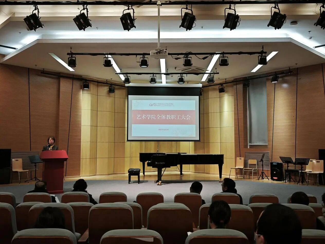 2025年12月3日下午,艺术学院推进全面从严治党暨师德师风警示教育全体教职工大会在学院音乐厅举行。学院党委书记付春梅结合近期党建工作主要任务,明确学院全面从严治党工作要求,做师德师风警示教育;学院副院长、党委委员安姚舜、顾亚奇分别结合工作实际,对关于教师行为准则、课堂讲授纪律、研究生导师指导行为规范、学术不端行为处理办法等文件进行解读领学;学院党委副书记、纪委书记李晰结合师德失范处理相关规定和有关案例作警示教育;学院院长、党委副书记张淳结合学院事业发展做总结讲话。会议由学院党委书记付春梅主持。