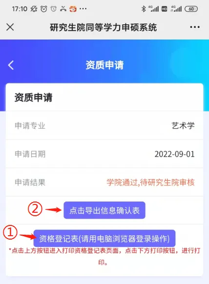 发送邮件后,学院将按照邮箱中收到的邮件逐一进行审核。审核通过,学员即可在系统下载打印资格登记表(见下图标记1位置,审核通过才会看到相应按钮)。