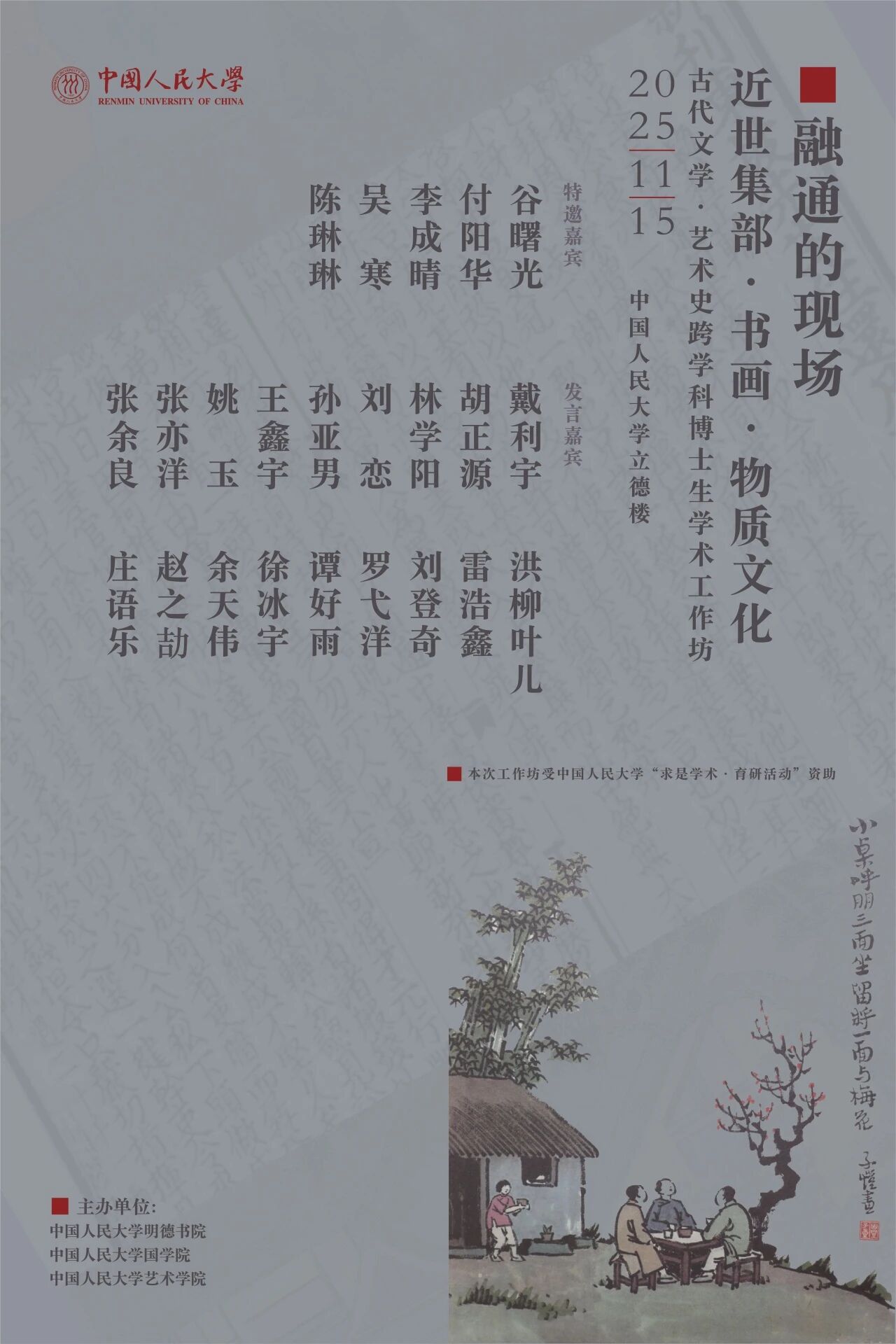 本次学术工作坊为期一天(11月15日),具体议程及后续事宜将另行发布,敬请学界同仁持续关注。本次工作坊受到中国人民大学求是育研项目资助,为“缥缃翰墨:艺文融通与中国古典学的物性转向”团队的阶段性成果。