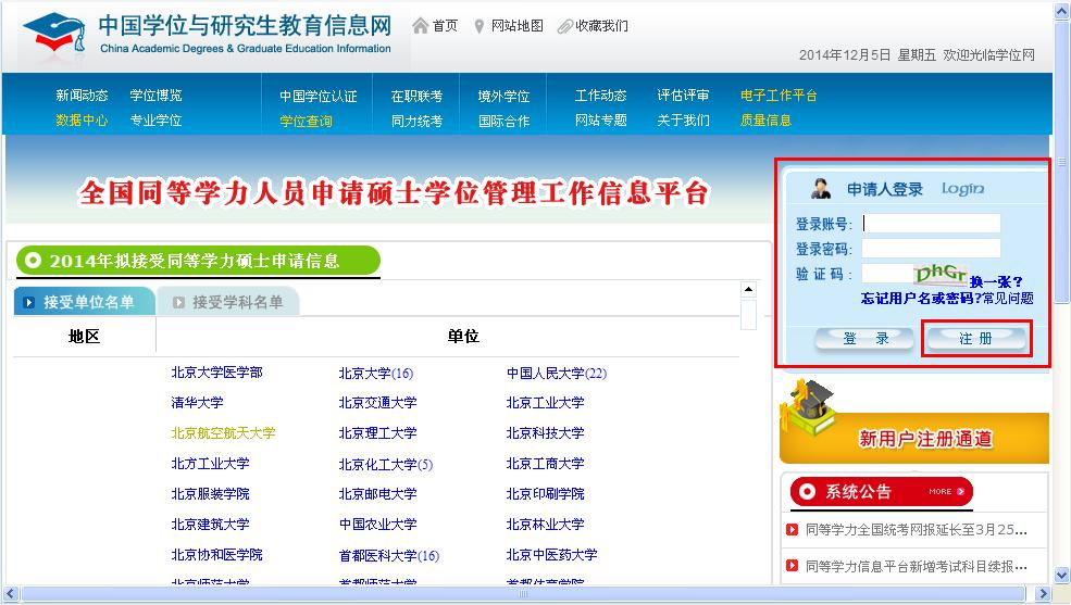 即时起,学员可访问信息平台注册账号(注册功能在网页右上角,详见上图)。注册账号之后登录信息平台,找到“进入系统”按钮,点击该按钮正式进入信息平台。然后按照提示流程上传电子照片、填写基本信息及提交学位申请。