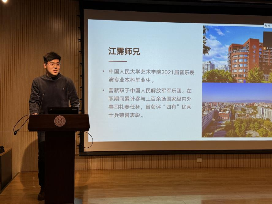 2021届音乐表演专业本科毕业生、曾服役于中国人民解放军军乐团的江霈,分享了军队文职的报考经验与工作特点,并鼓励同学们树立家国情怀,在职业选择中融入责任与担当。