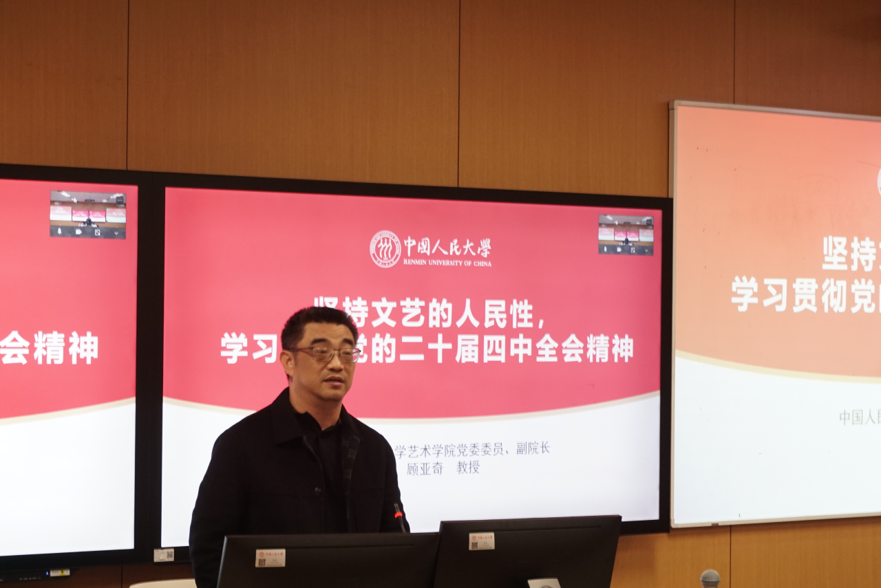 11月5日,本期院党校第三讲“坚持文艺的人民性,学习贯彻党的二十届四中全会精神”专题党课由艺术学院副院长顾亚奇教授主讲。课程以延安文艺座谈会、新时代文艺工作座谈会与党的二十届四中全会精神为脉络,系统阐释了文艺为人民服务的根本方向与文化强国建设的战略部署。这既是一场文艺理论与实践深度交融的思想盛宴,也是一次在新时代背景下对文艺使命的深刻探寻。