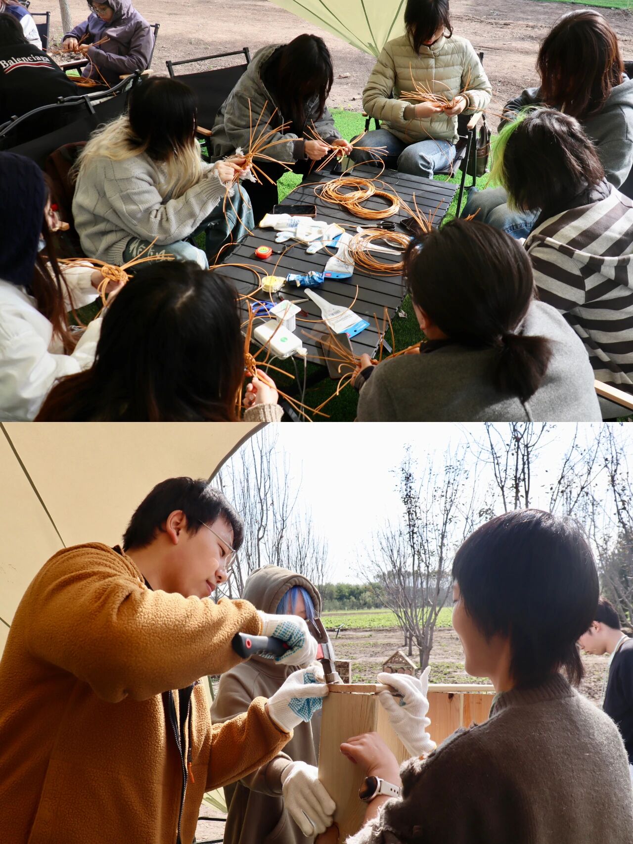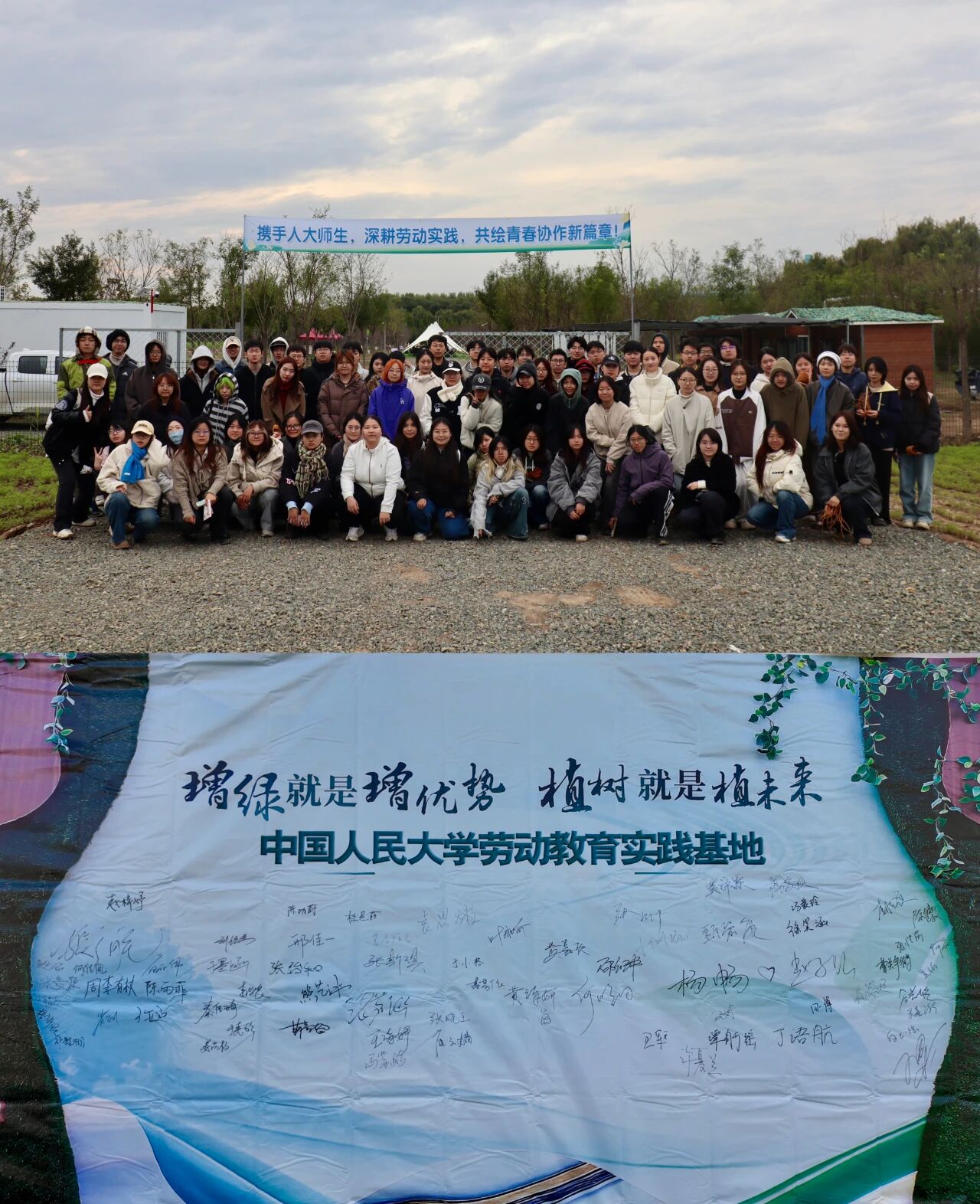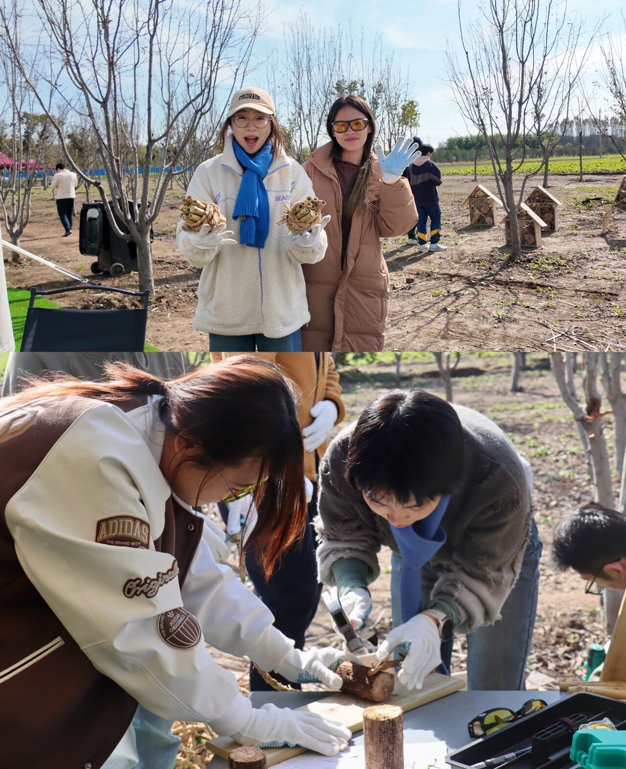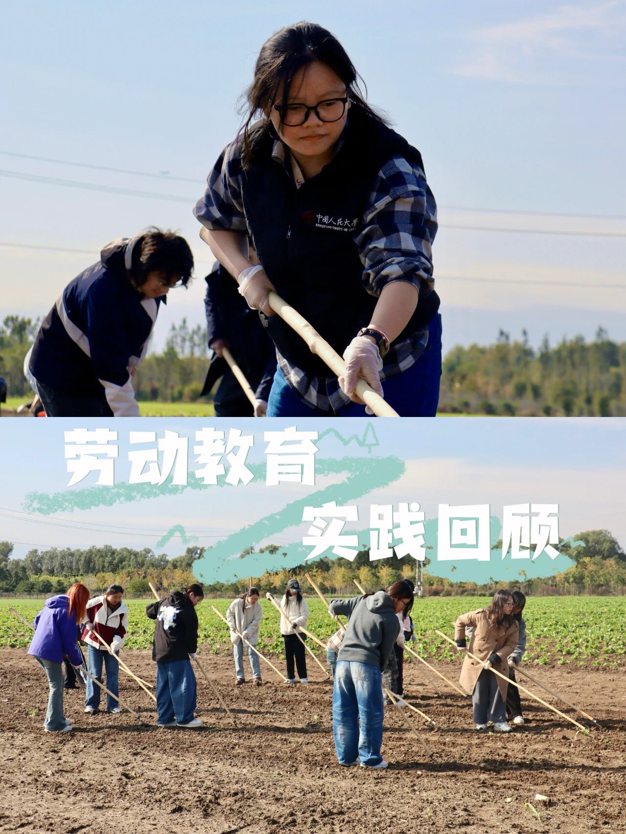 在潮白河畔的潞城集体林场,2022、2023级本科生用双手丈量秋日的土地。播下小麦种子、搭建昆虫旅馆、修剪树木枝条、编制人造鸟巢——一锄一镰间,泥土的气息与汗水的温度交织成最真切的课堂。中国人民大学艺术学院师生在劳动教育实践中,将自然当作画布,把劳动当作创作,于田野之间体悟生命的秩序与美感,让青春在耕耘中闪光。