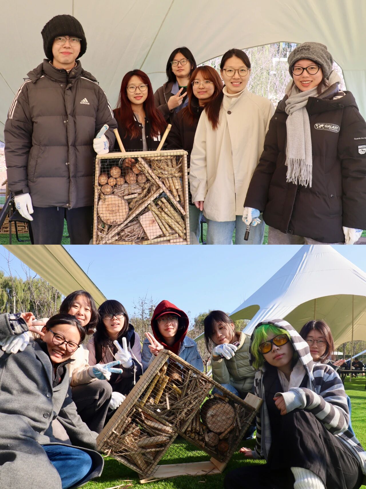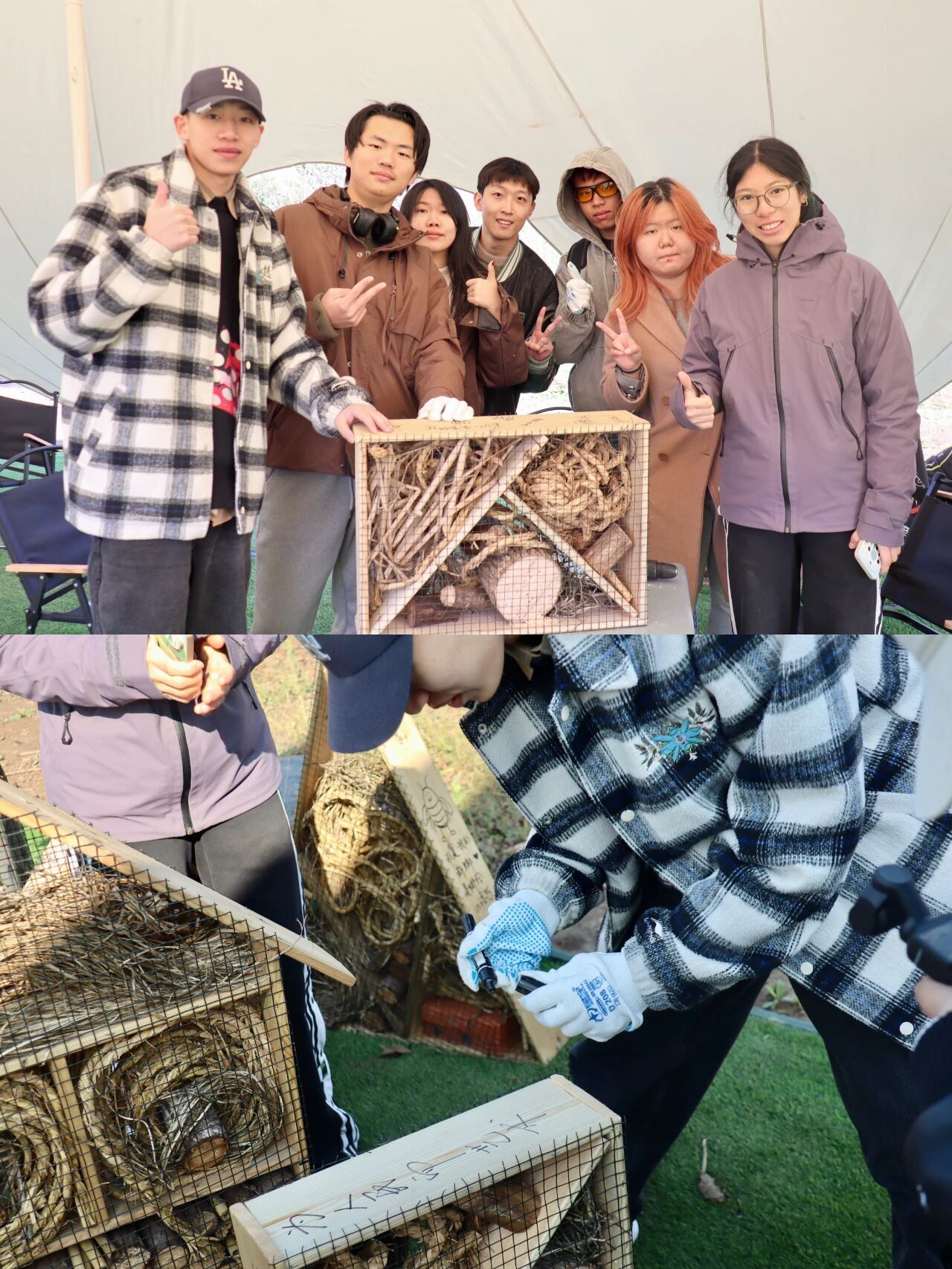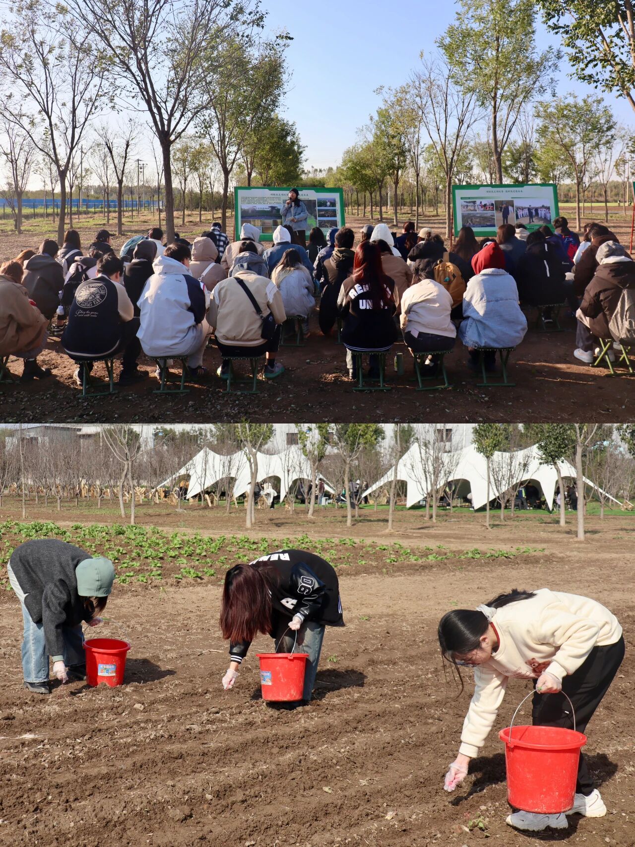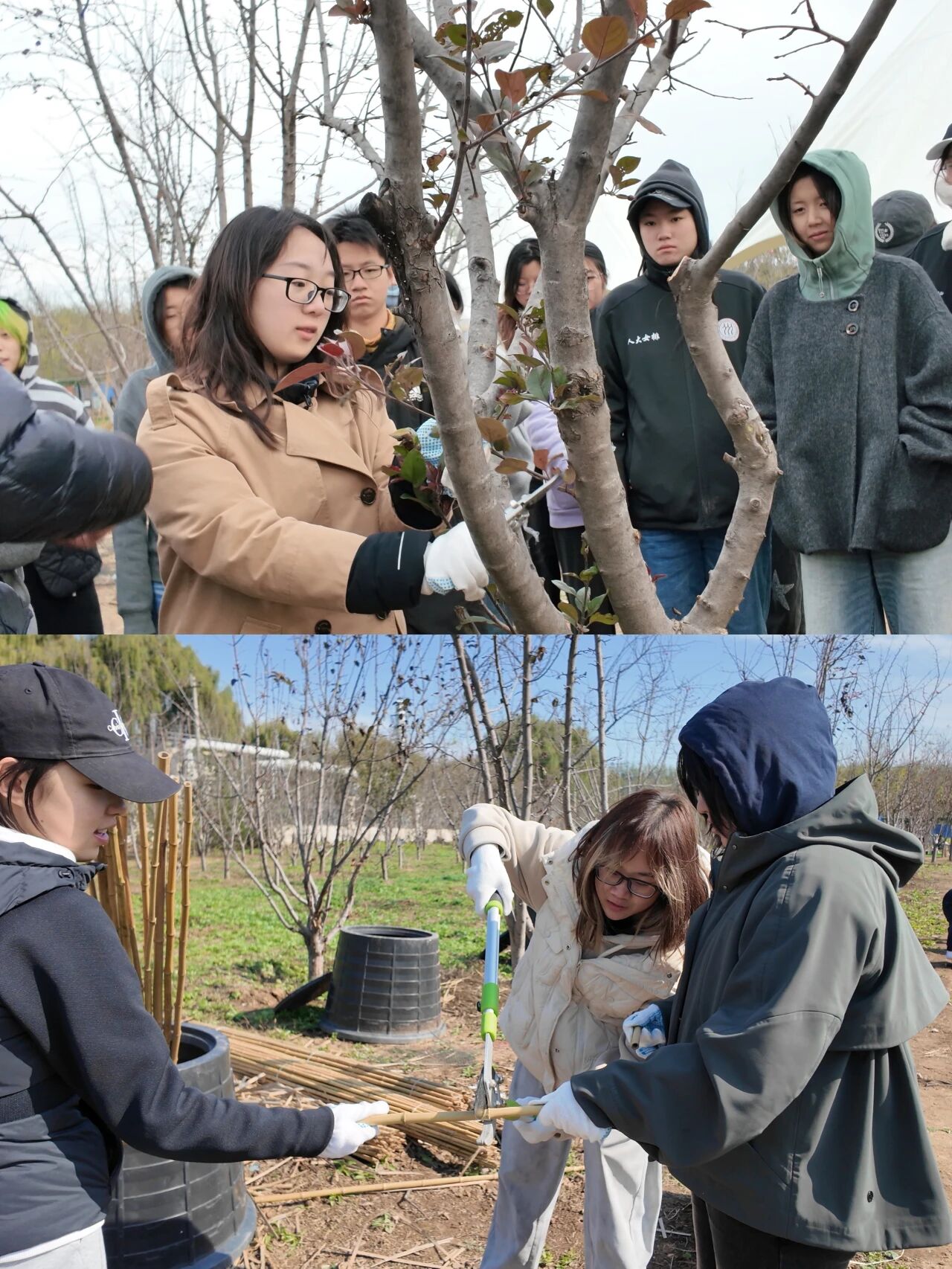 在潮白河畔的潞城集体林场,2022、2023级本科生用双手丈量秋日的土地。播下小麦种子、搭建昆虫旅馆、修剪树木枝条、编制人造鸟巢——一锄一镰间,泥土的气息与汗水的温度交织成最真切的课堂。中国人民大学艺术学院师生在劳动教育实践中,将自然当作画布,把劳动当作创作,于田野之间体悟生命的秩序与美感,让青春在耕耘中闪光。