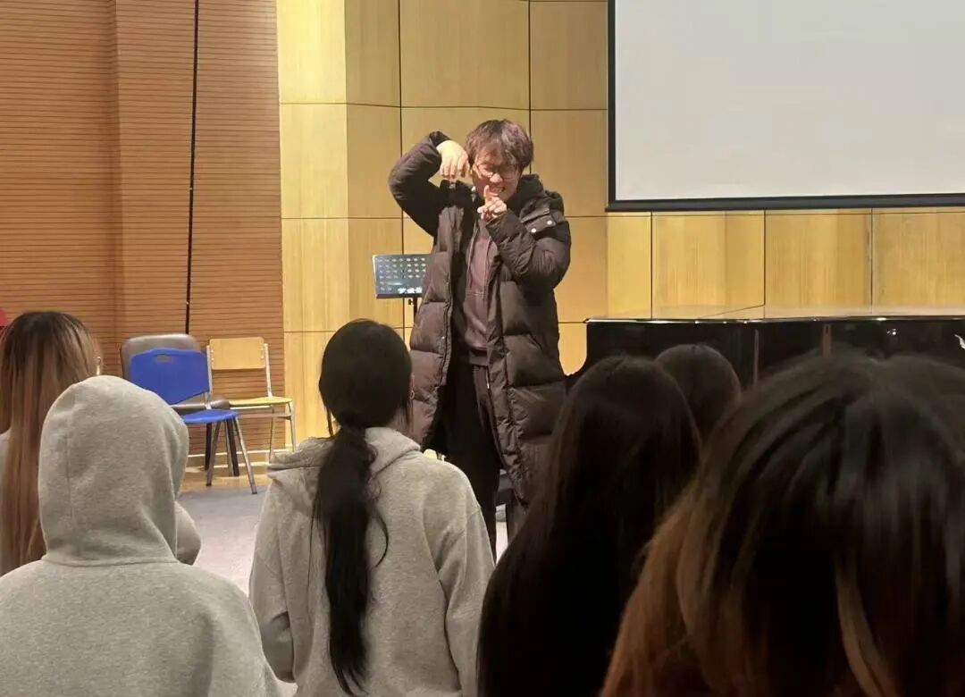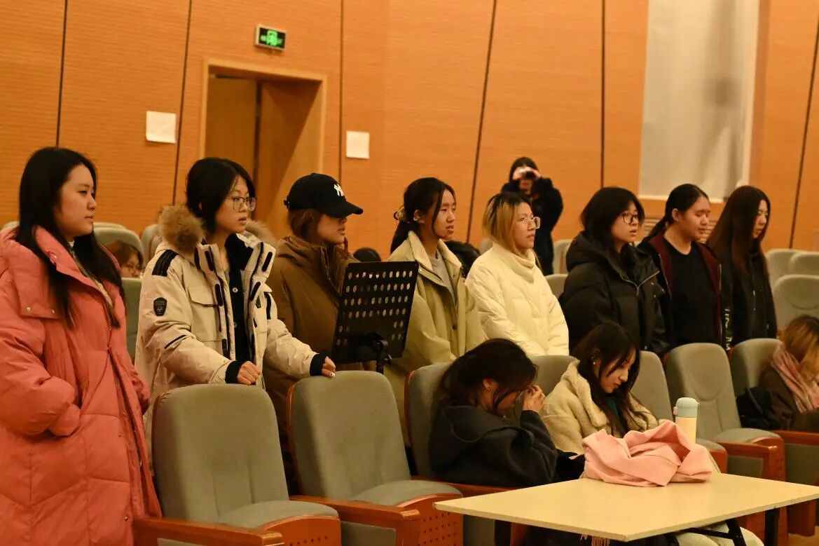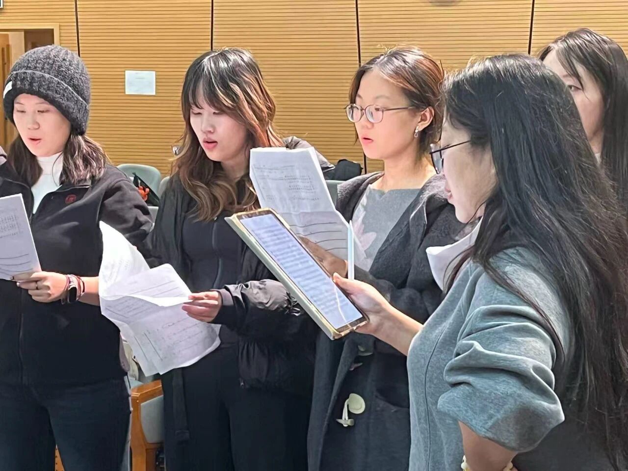 展演筹备之初,艺术学院便定下“学生自主、以老带新”的排练模式。来自音乐系声乐专业的本科生李雨桐、曾丽、刘远涛、王粒沣等凭借专业功底扛起排练重任,从曲谱拆分到声部合练,从气息控制到情感表达,全程亲力亲为:逐句标注旋律重难点,用钢琴逐声部伴奏校准音准,将肢体律动融入合唱编排,让舞台呈现更具感染力。